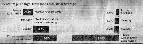 Nixon's resignation caused severe turmoil on Wall Street. Although the Nixon scandal had already taken most of its toll on the sharemarket before the actual resignation, the Dow Jones continued to decline steadily for three weeks after, dropping by 10%.